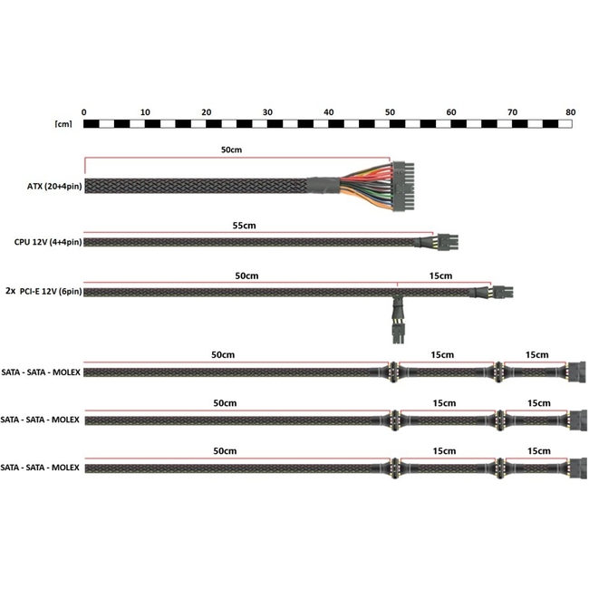 - 3x Molex connector (on 3 cables 80cm long, flat black, shared with SATA)