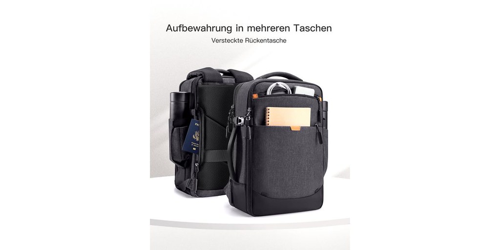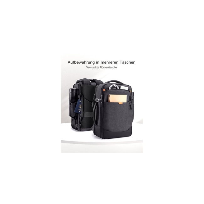 - One main compartment with 180° opening, laptop compartment, iPad compartment, two front pockets, one side bottle pocket, two internal zipper pockets, anti-theft back zipper pocket