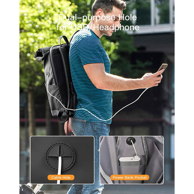 - Dual access (roll-top and back zipper), multiple pockets, headphone/charging cable hole