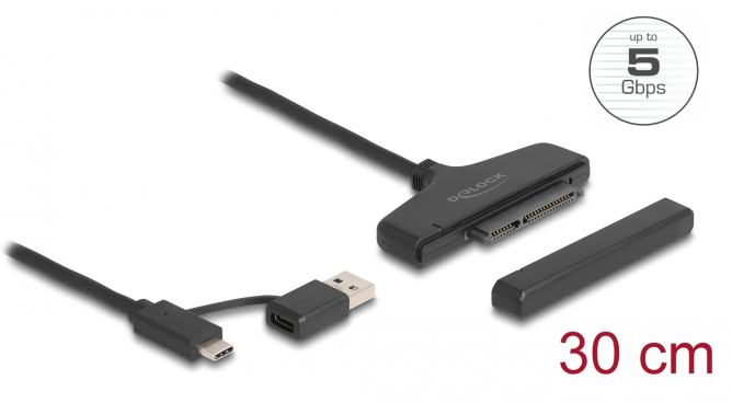 Αυτός ο αντάπτορας της Delock μπορεί να χρησιμοποιηθεί για την σύνδεση ενός 2.5" SATA HDD ή SSD με έναν επιτραπέζιο ή φορητό υπολογιστή μέσω θύρας USB ή USB-C.