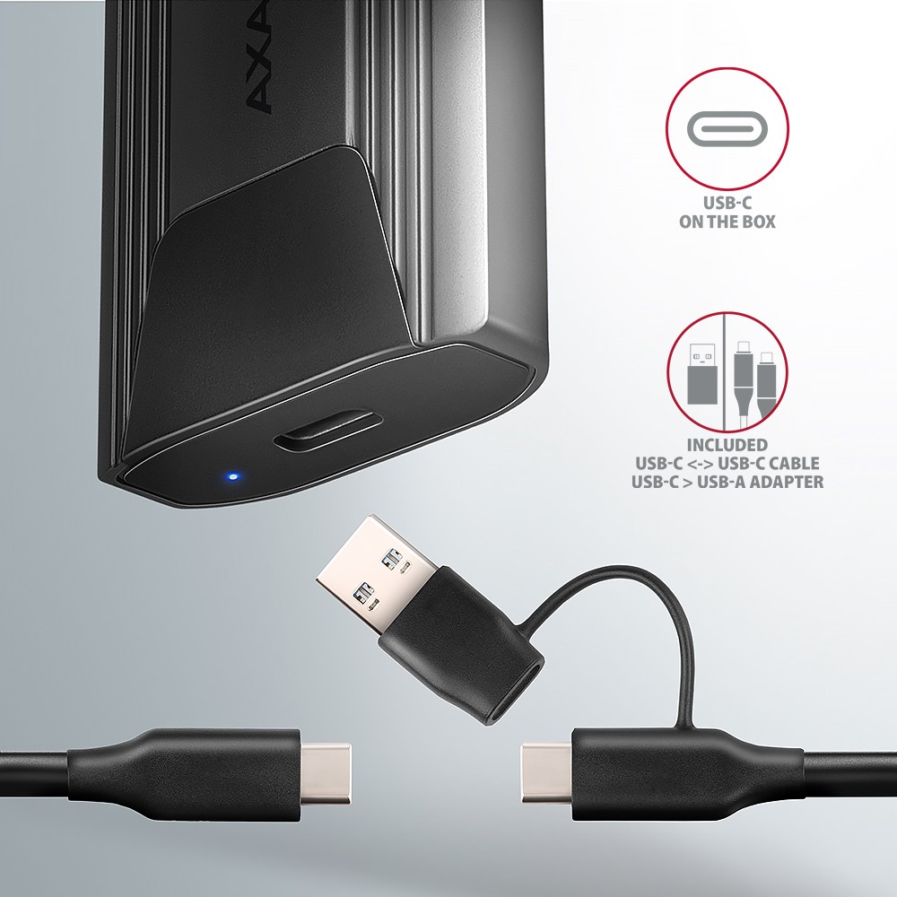 Universal external AXAGON EEM2-GTS2 THIN SCREWLESS box with USB 10Gbps interface for M.2 NVMe or SATA SSD disks. The double-sided USB-C connector on the box enables a reliable connection. The package includes not only a USB-C -> USB-C cable for connecting the box to a computer, but also a USB-C -> USB-A adapter. You can connect the box to any free USB port on the notebook.