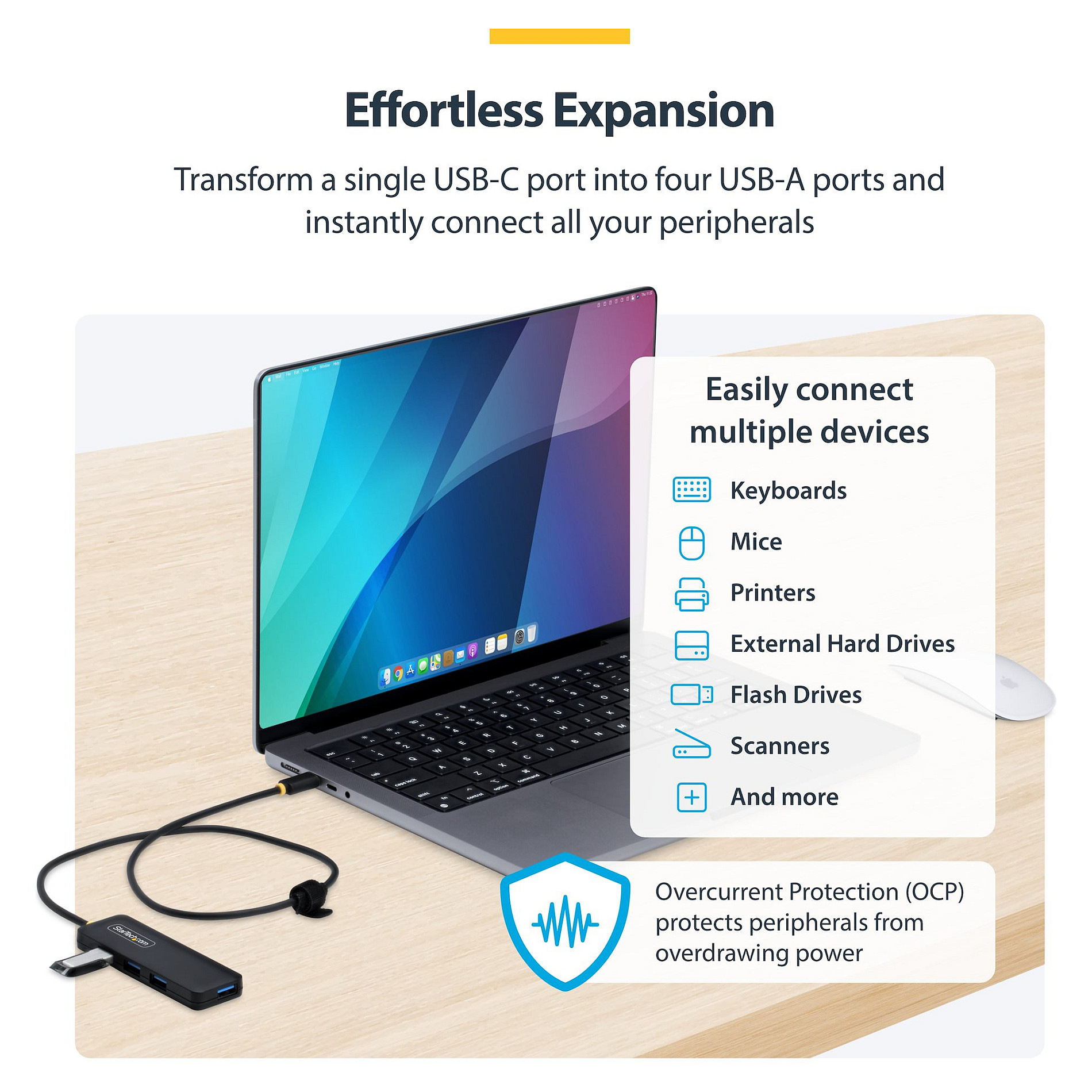 Ο StarTech 4-Port USB-C Hub είναι μια πολυλειτουργική προσθήκη στο τεχνολογικό σας κιτ. Αυτός ο κόμβος σας επιτρέπει να συνδέσετε έως και τέσσερις συσκευές USB-A σε μία μόνο υποδοχή USB-C φιλοξενίας, κάνοντάς τον ιδανικό για μια σειρά περιφερειακών.