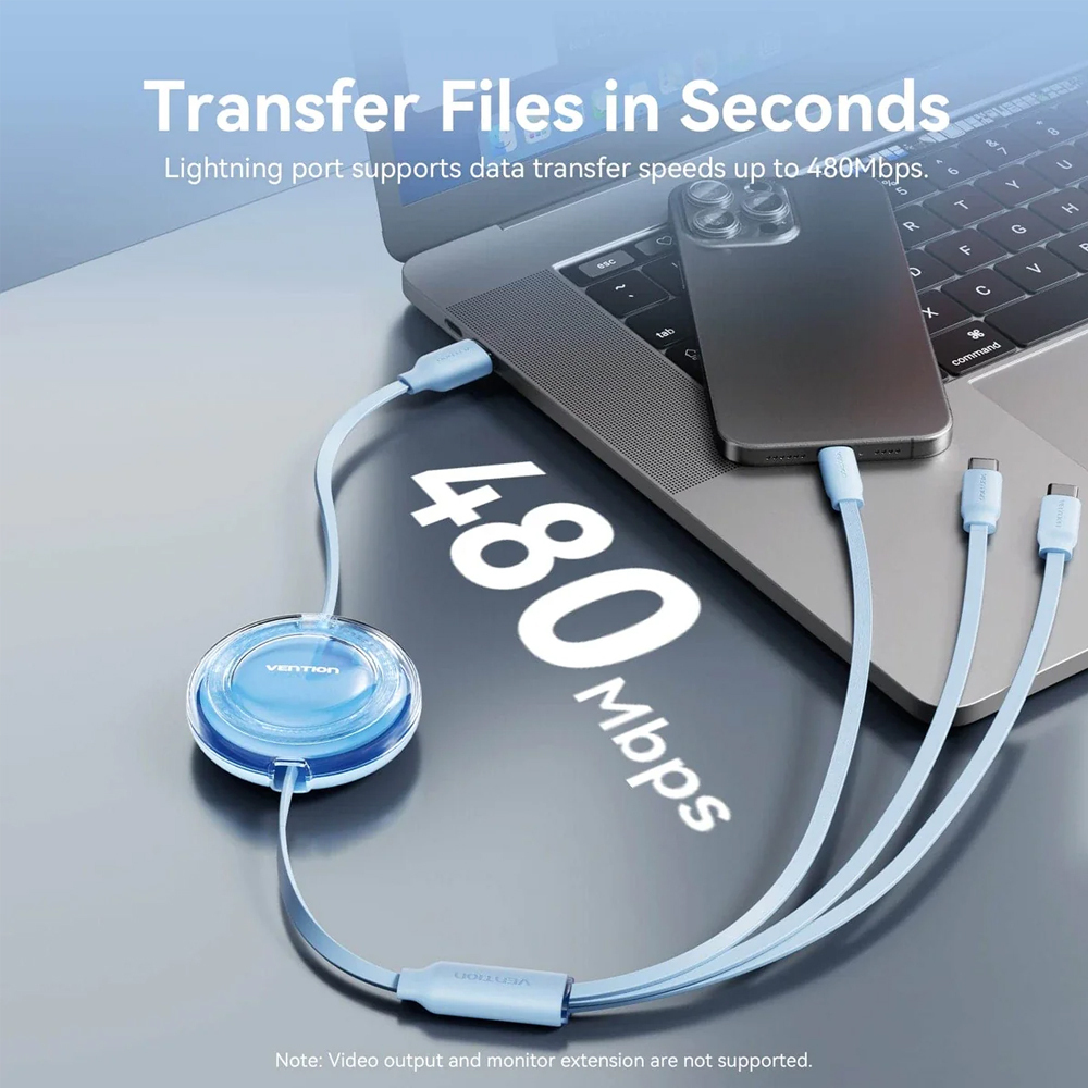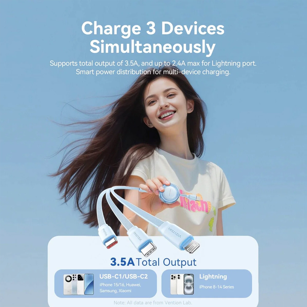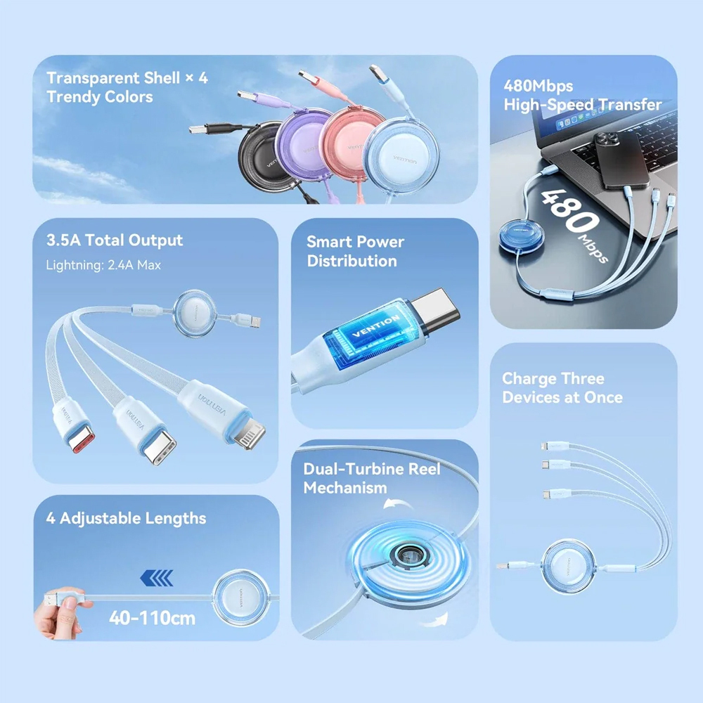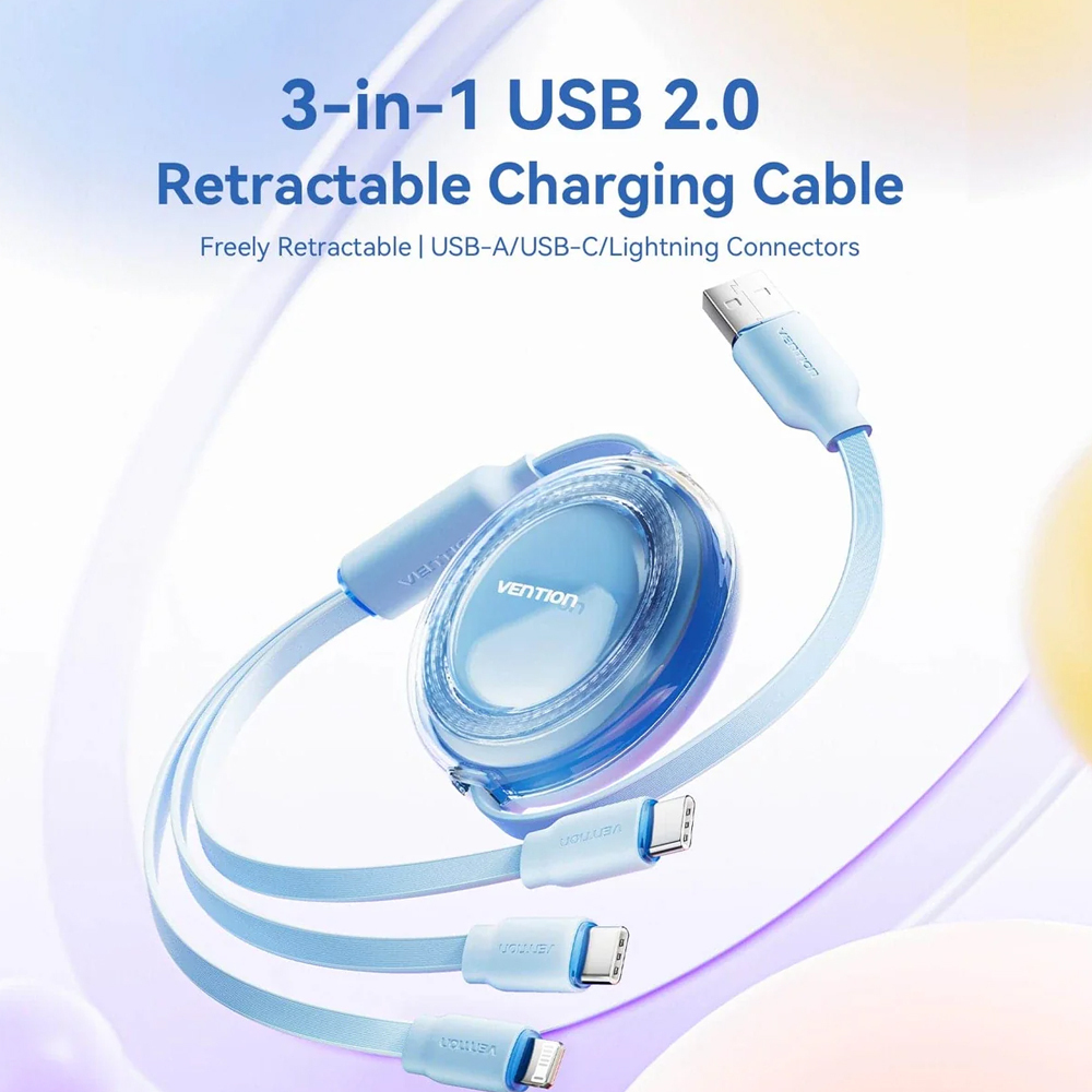 VENTION Default 3 in 1 USB 2.0 Type A Male to USB C Male USB C Male and Lightning Male Retractable Cable 1.1m Blue