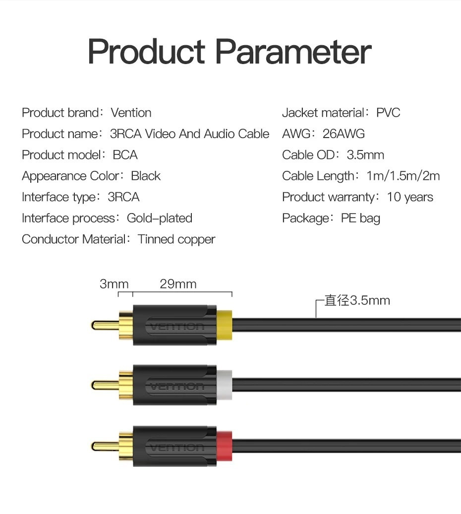 VENTION AV Cable 3 RCA Male to Male 1.5M Black BCABG