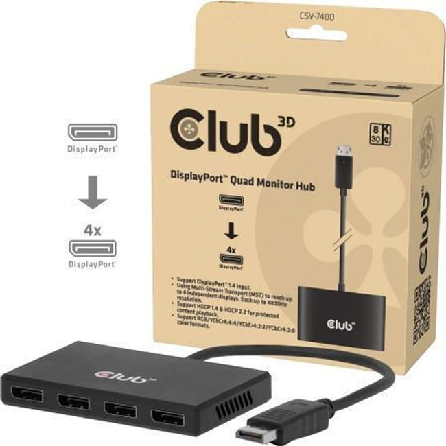 The Club 3D CSV-7400 is a Multi Stream Transport (MST) Hub designed for seamless multi-display expansion via a single DisplayPort connection. This device significantly boosts productivity, allowing users to connect multiple monitors simultaneously from one DisplayPort input.