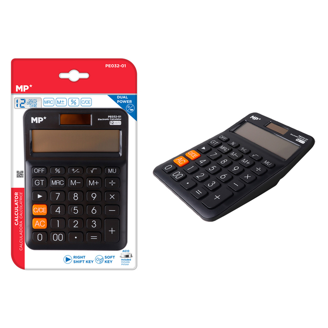 MP αριθμομηχανή PE032-01, ηλιακό & μπαταρίες, 12 ψηφία, μαύρη