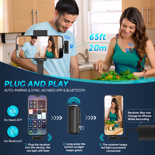 Συνδέεται με το smartphone ή tablet σας ασύρματα, μέσω του receiver και της θύρας Lightning. Η στερέωση του μικροφώνου γίνεται εύκολα στο ρούχο σας με κλιπ συγκράτησης.