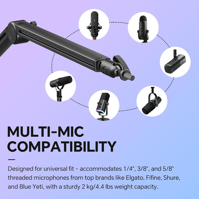 Διαθέτει ιδιαίτερα μακρύ μεταλλικό βραχίονα ο οποίος μπορεί να προσαρμοστεί κατά 360° και να ρυθμιστεί σε 2 σημεία, ώστε να βρείτε το ιδανικό ύψος και κλίση.
