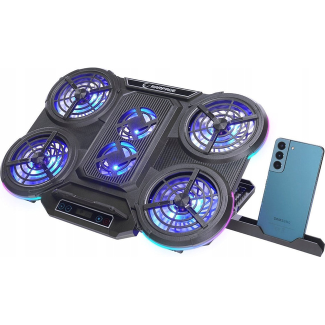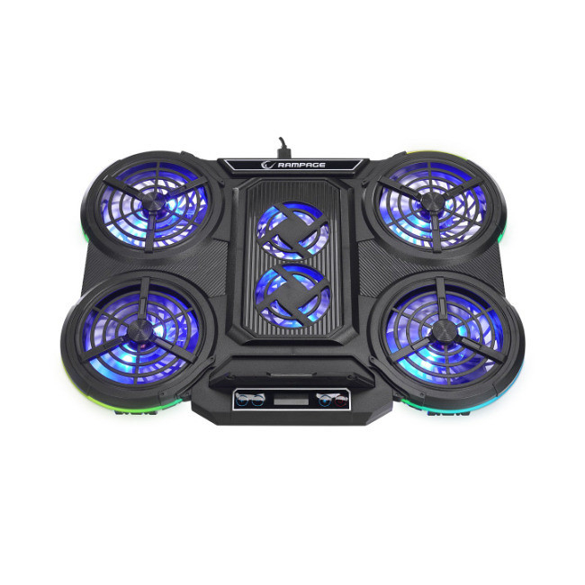 The Rampage PROTE R6 is a cutting-edge gaming laptop cooling pad designed to support laptops ranging from 10 to 17 inches. This innovative device features an impressive 6 fans system, composed of 4 large fans (100x100x15 mm) for intense cooling and 2 small fans (70x70x15 mm) that aid in auxiliary airflow.
