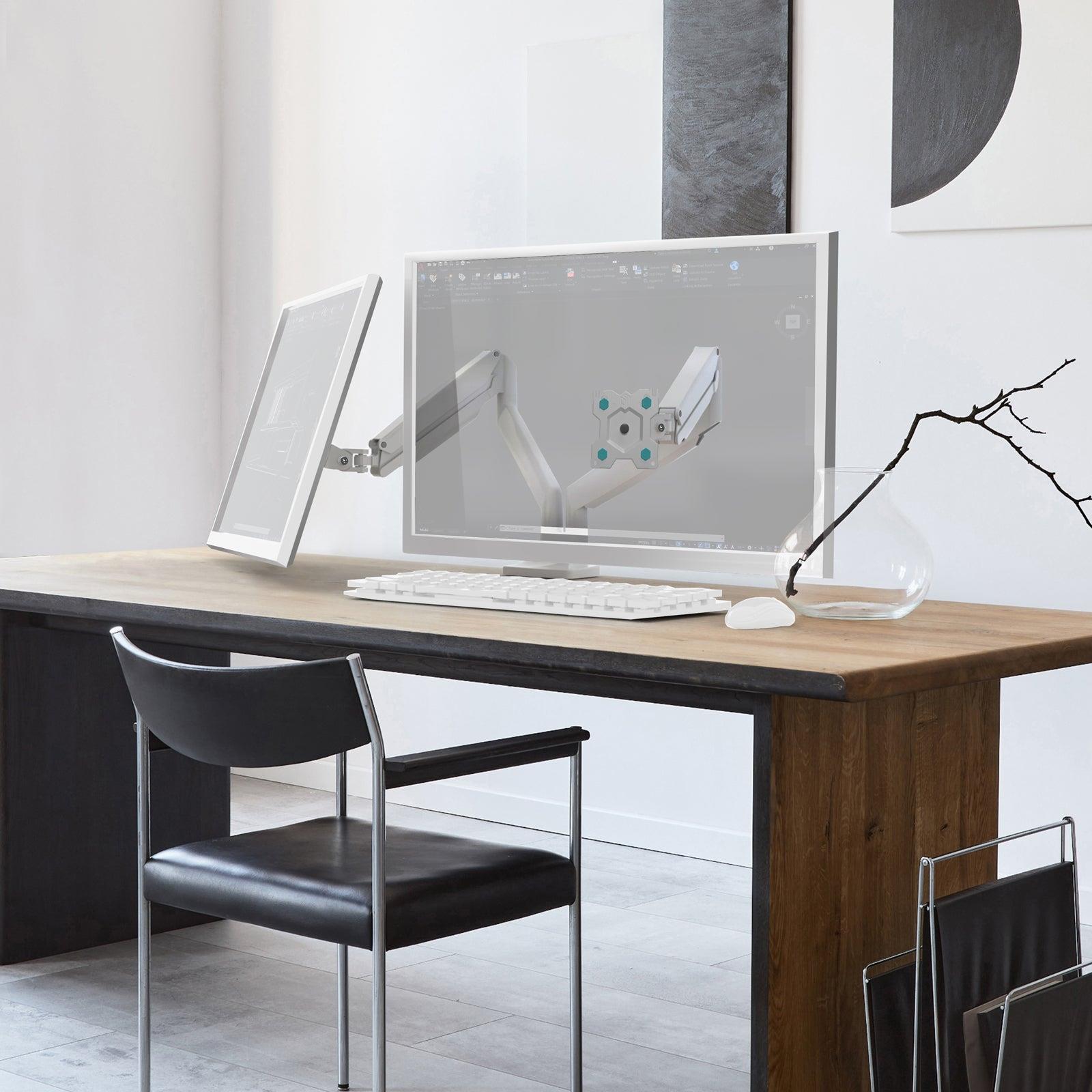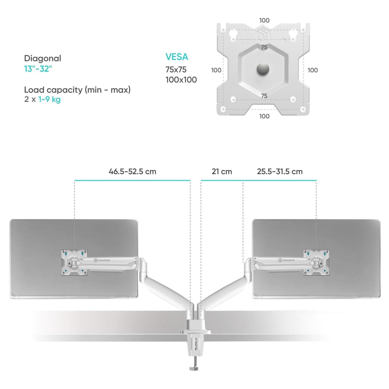 The ONKRON G200-W is a versatile and stylish dual monitor desk mount that caters to the needs of users with dual flat or curved screens. This mount is compatible with monitors ranging from 13 to 32 inches with a weight capacity of up to 19.8 lbs (9 kg) per arm.