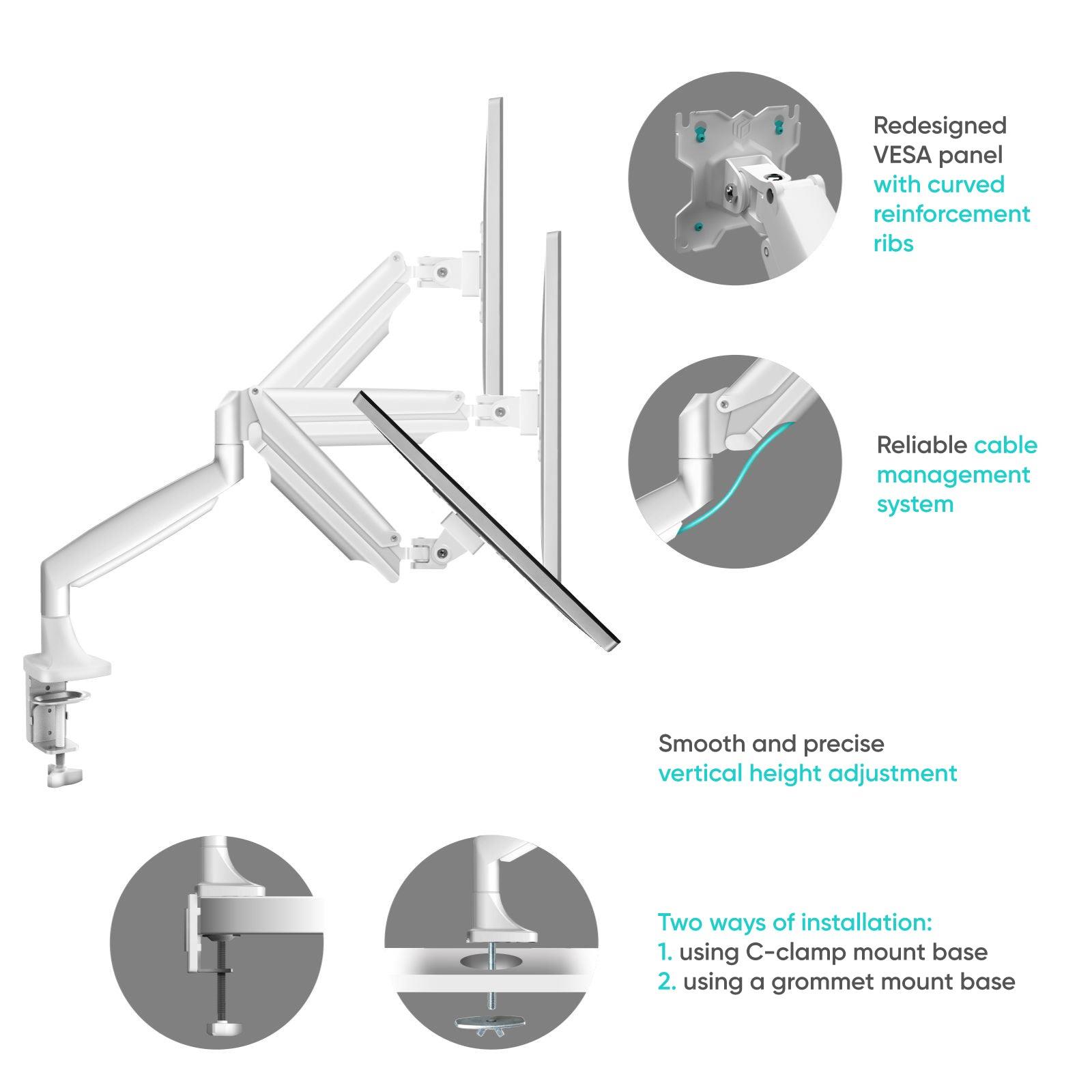 This mount is constructed with durable gas spring arms and provides a complete assembly kit for easy installation. Its an ideal choice for those looking to maximize their workspace and ensure ergonomic comfort.