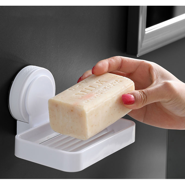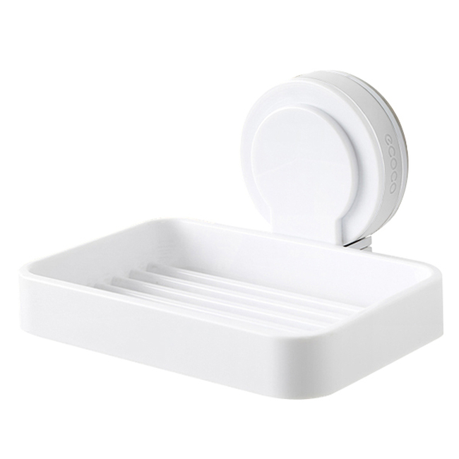 Βάση μπάνιου της Ecoco για σαπούνι, σε λευκό χρώμα. Τοποθετείται εύκολα στον τοίχο με αυτοκόλλητο το οποίο αποσπάται από την βάση, διευκολύνοντας τον καθαρισμό της.