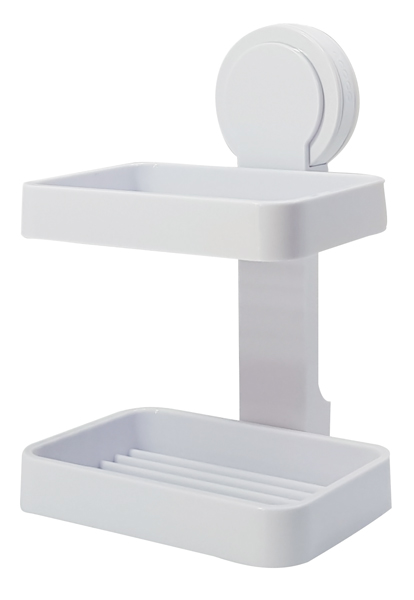 Βάση μπάνιου της Ecoco με 2 θέσεις για σαπούνι, σε λευκό χρώμα. Τοποθετείται εύκολα στον τοίχο με αυτοκόλλητο το οποίο αποσπάται από την βάση, διευκολύνοντας τον καθαρισμό της.