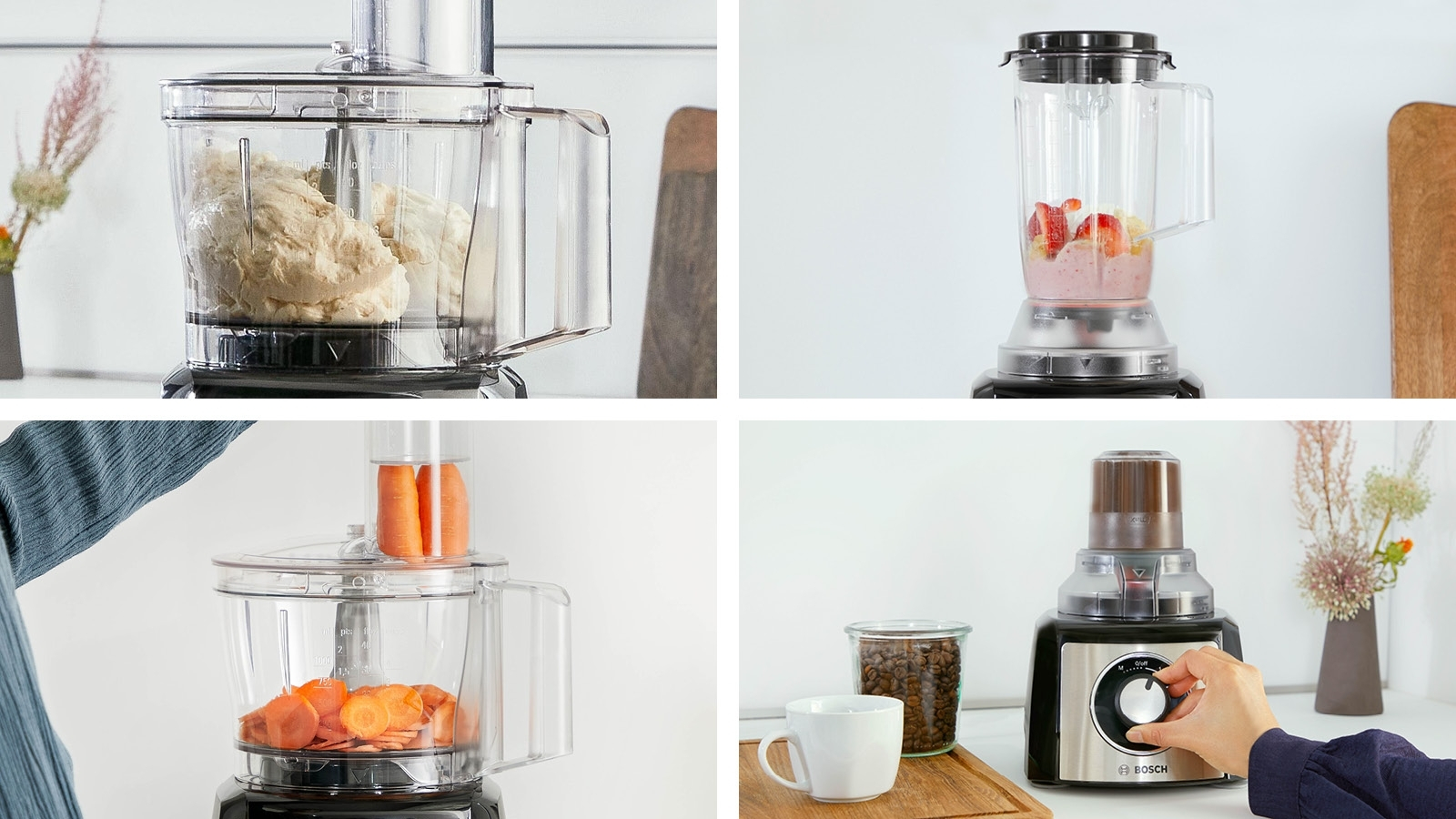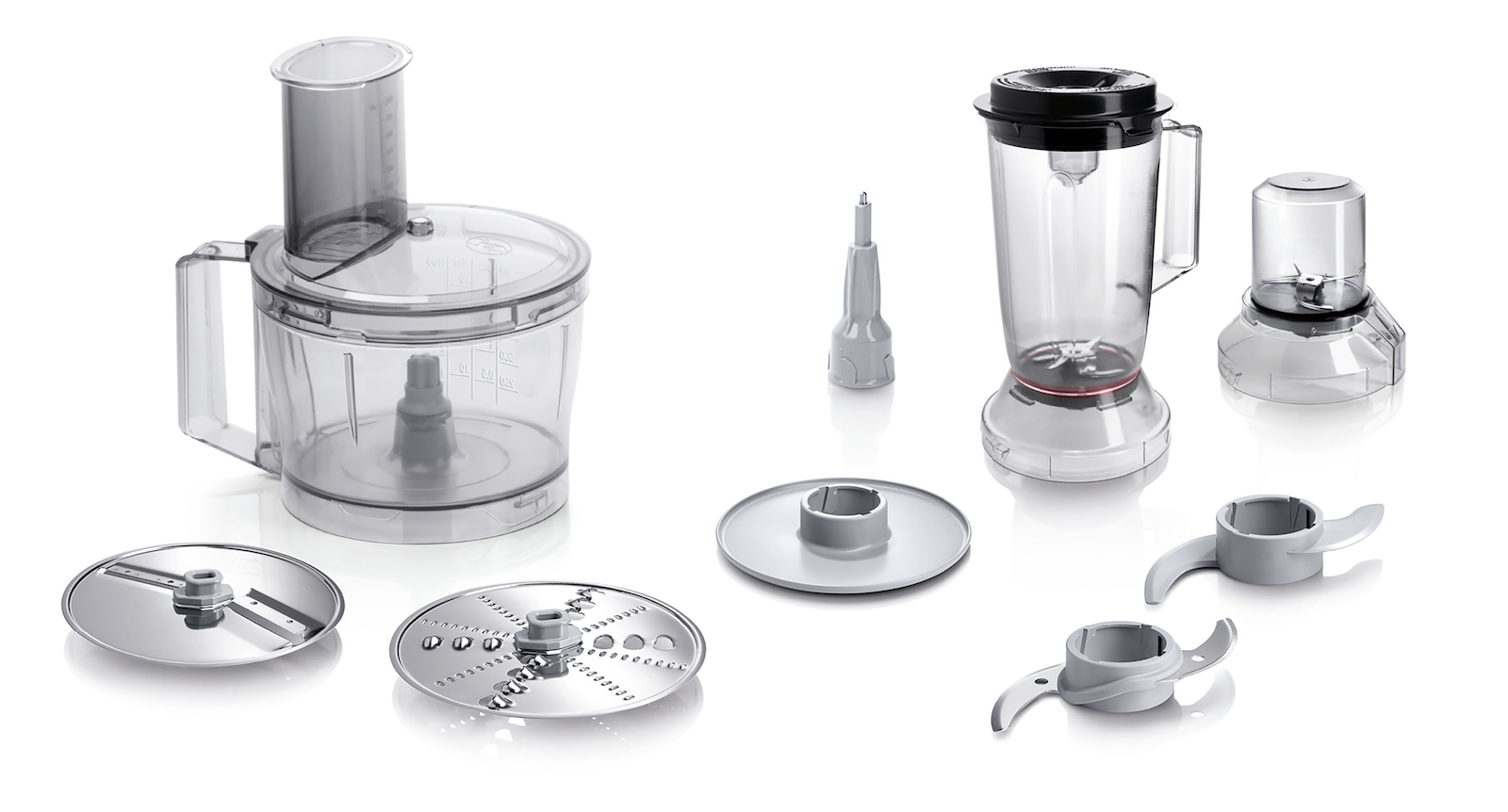 Included AccessoriesTransparent lid with funnel/stuffer/pusher; 2.3L mixing bowl; 1L blender attachment; reversible shredding disc; reversible slicing disc; beating/whisking disc; universal knife/chopper blade; dough tool; grinding blade; accessory carrier; blade protection cap