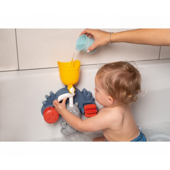 Fill the tank with the 3 cups included, then turn the tap to spin the water wheels and squirt water from the hippo' s mouth.