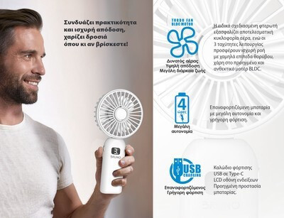 Διαθέτει επαναφορτιζόμενη μπαταρία με αυτονομία έως 4 ώρες συνεχούς λειτουργίας και γρήγορη φόρτιση. Η τριπλή φτερωτή εξασφαλίζει αποτελεσματική κυκλοφορία αέρα, ενώ οι 3 ταχύτητες λειτουργίας προσφέρουν ισχυρή ροή με χαμηλά επίπεδα θορύβου, χάρη στο προηγμένο και ανθεκτικό μοτέρ BLDC.