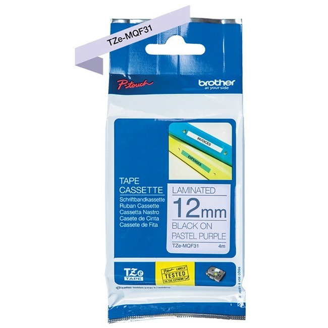 The Brother Laminated Tape P-Touch TZe-MQF31 is a high-quality, laminated label tape designed for use with Brother P-Touch label makers. This product features a unique black print on a pastel purple background, making it visually appealing and versatile for various labeling applications.