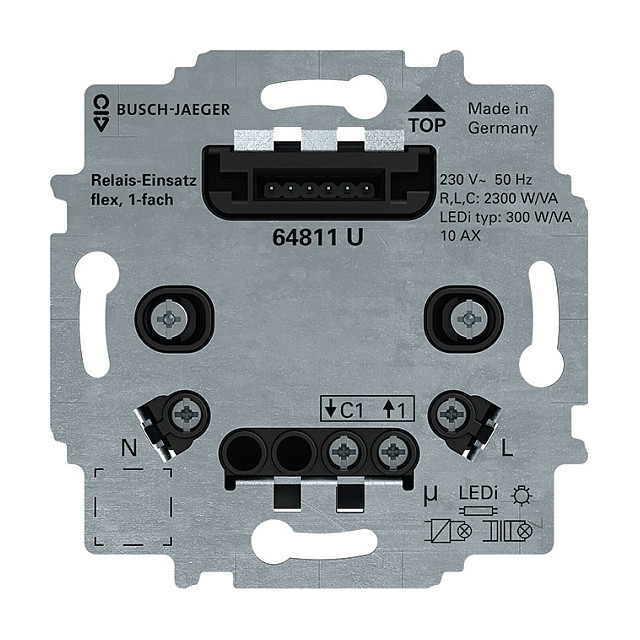 The BUSCH JAEGER Relais-Einsatz flex 1-fach 230 V is a specialized relay insert designed for various lighting systems in modular flex installations. It offers a seamless integration for switching functionalities while requiring a three-wire connection including a neutral conductor.
