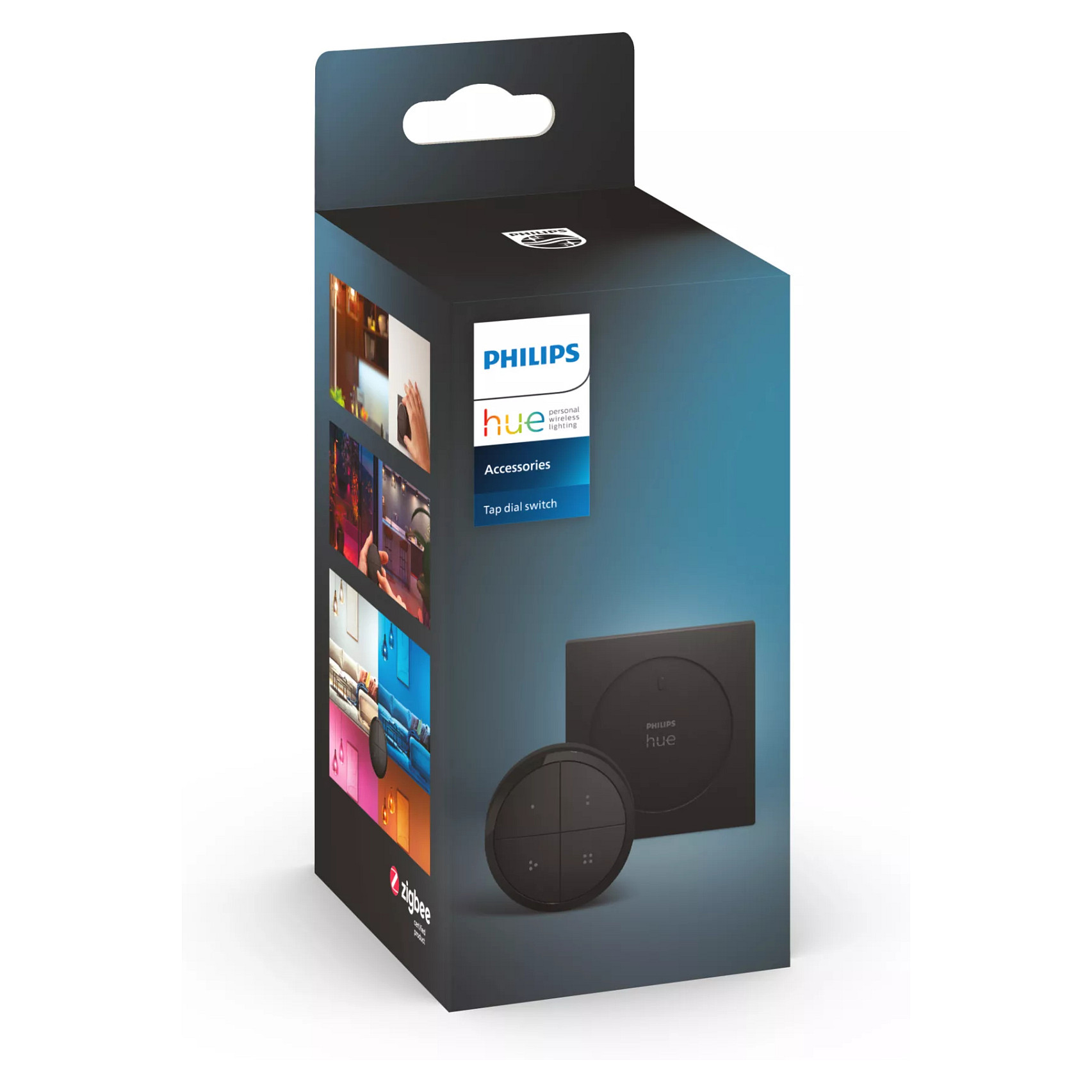 The Philips Hue Tap Dial Switch Black is an innovative battery-powered remote control designed for seamless interaction with Philips Hue lights. Its compact and stylish design features a black matte finish that fits perfectly in modern homes.