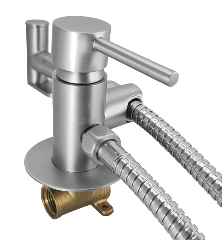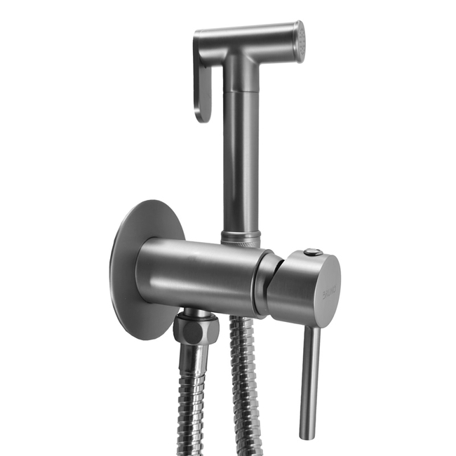 Εντοιχιζόμενη μπαταρία μπιντέ με παροχή ζεστού και κρύου νερού της Bruno, ιδανική για πλύση της λεκάνης ή της ατομικής υγιεινής. Διαθέτει τηλέφωνο με εύκαμπτο σπιράλ και σύστημα αυτόματης διακοπής της παροχής νερού.