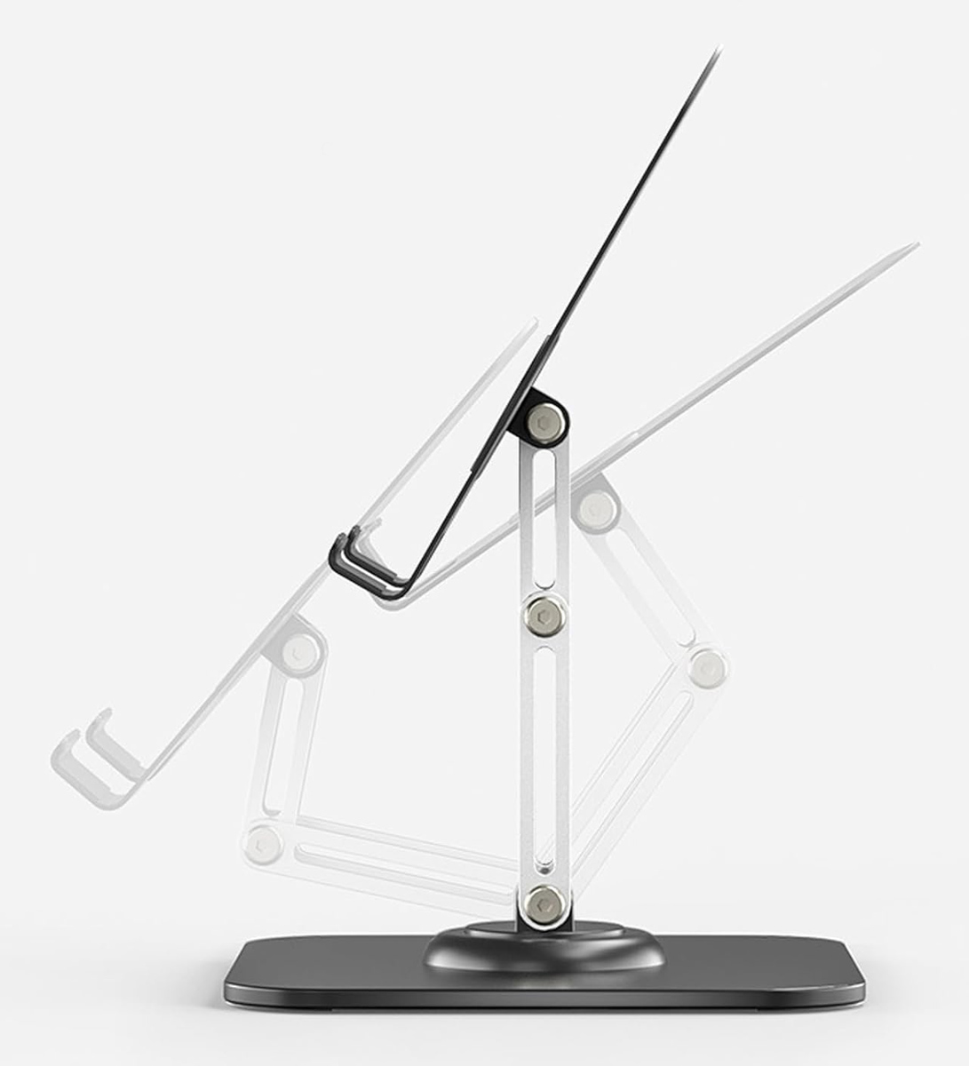 Είναι μεταλλική, περιστρεφόμενη κατά 360° και ρυθμιζόμενη σε ύψος αλλά και κλίση. Είναι foldable και καταλαμβάνει μικρό όγκο όταν είναι κλειστή, για εύκολη μεταφορά σε τσάντα ή σακίδιο.