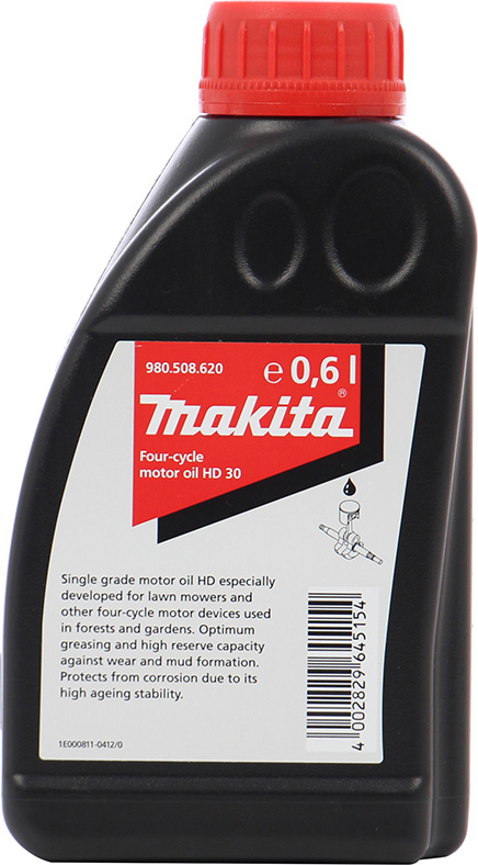 Makita 4-Takt Motor Oil HD30 is a high-performance engine oil for 4-stroke engines, developed for garden machinery such as lawn mowers, brush cutters and similar outdoor power equipment. It is supplied in a 600 ml bottle and uses HD30 single-grade viscosity. It provides reliable lubrication, wear protection, ageing stability and corrosion protection. The product matches manufacturer part number 980508620 and EAN 4002829645154. Suitable for use according to the engine manufacturer's specifications. Packaging unit: 1 bottle. Country of origin: Germany.