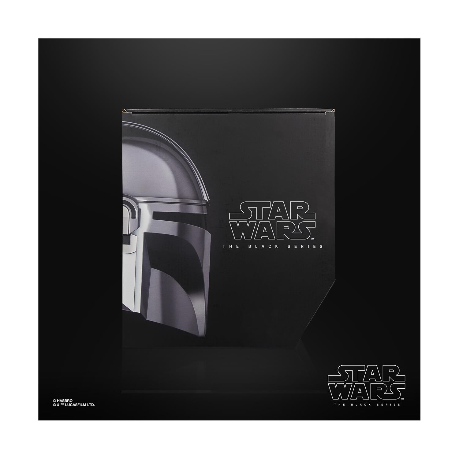 The Hasbro Star Wars The Black Series The Mandalorian Electronic Helmet (F0493) is a full-size, wearable collectible that is expertly modeled after the iconic Beskar helmet of the Mandalorian from the popular Disney+ series. This striking helmet is designed with a shiny "gunmetal" silver finish, accurately reflecting the look of Beskar steel.