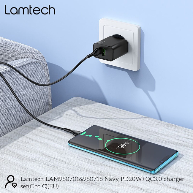 Φορτιστής Πρίζας Lamtech Dual Port Qc3.0/Pd20W With Type-C To Type-C 60W 1M Black