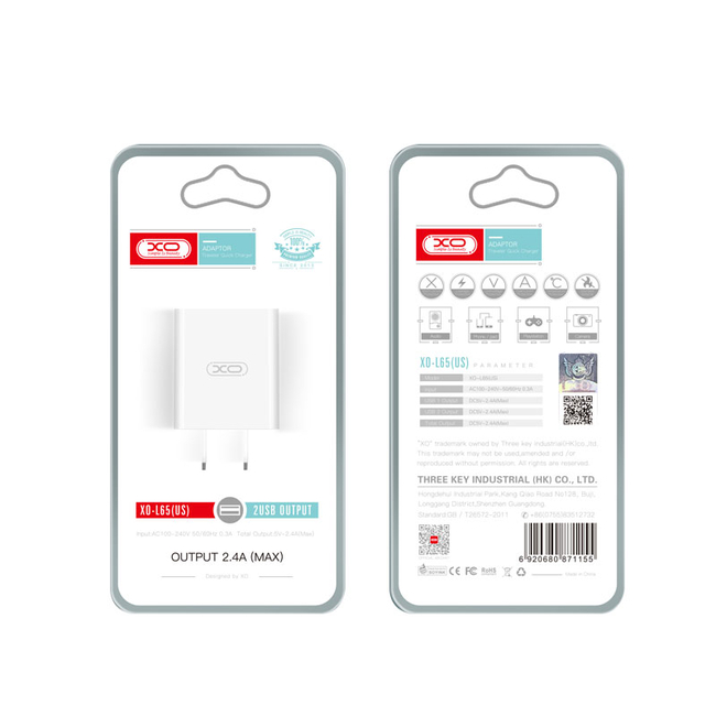 Φορτιστής Πρίζας XO L65EU 2.4A Διπλής Θύρας USB Φορτιστής ʼσπρο