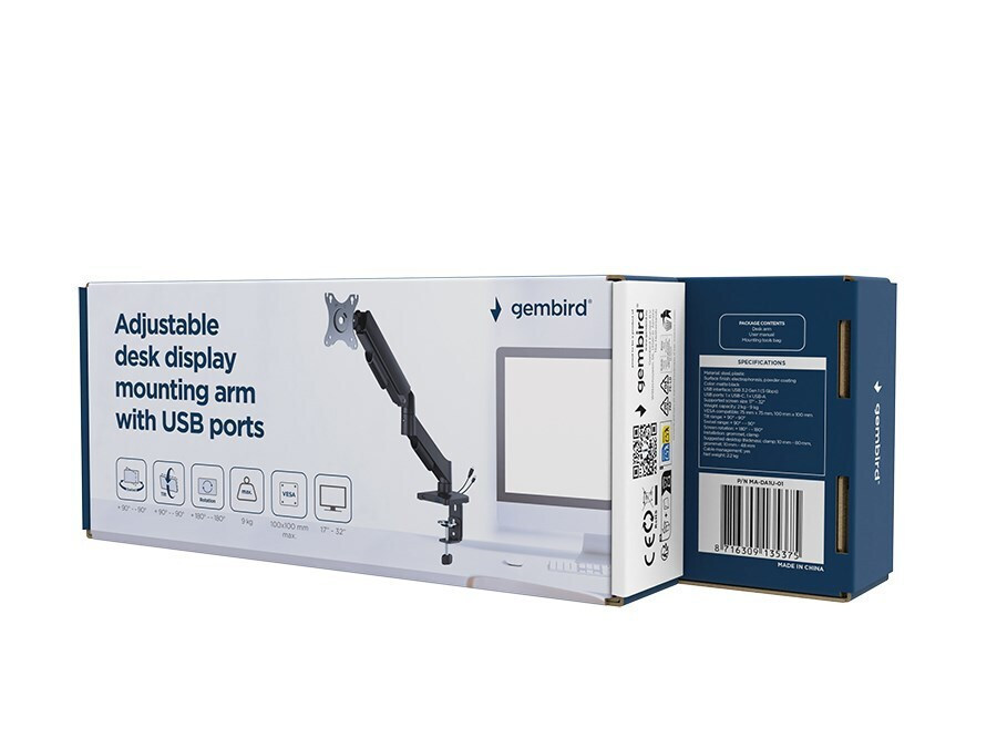 Gembird Adjustable Desk Display Mounting Arm with USB Ports 17 to 32 inches Black
