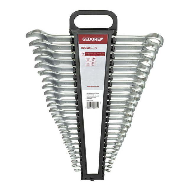 The Gedore Red Ratchet Spanner Set metric 24-pieces is a top-notch toolset specifically crafted for professionals and industrial settings. It contains a total of 24 spanners with sizes ranging from 6 mm to 32 mm, ensuring versatility and comprehensive coverage in a wide metric range.