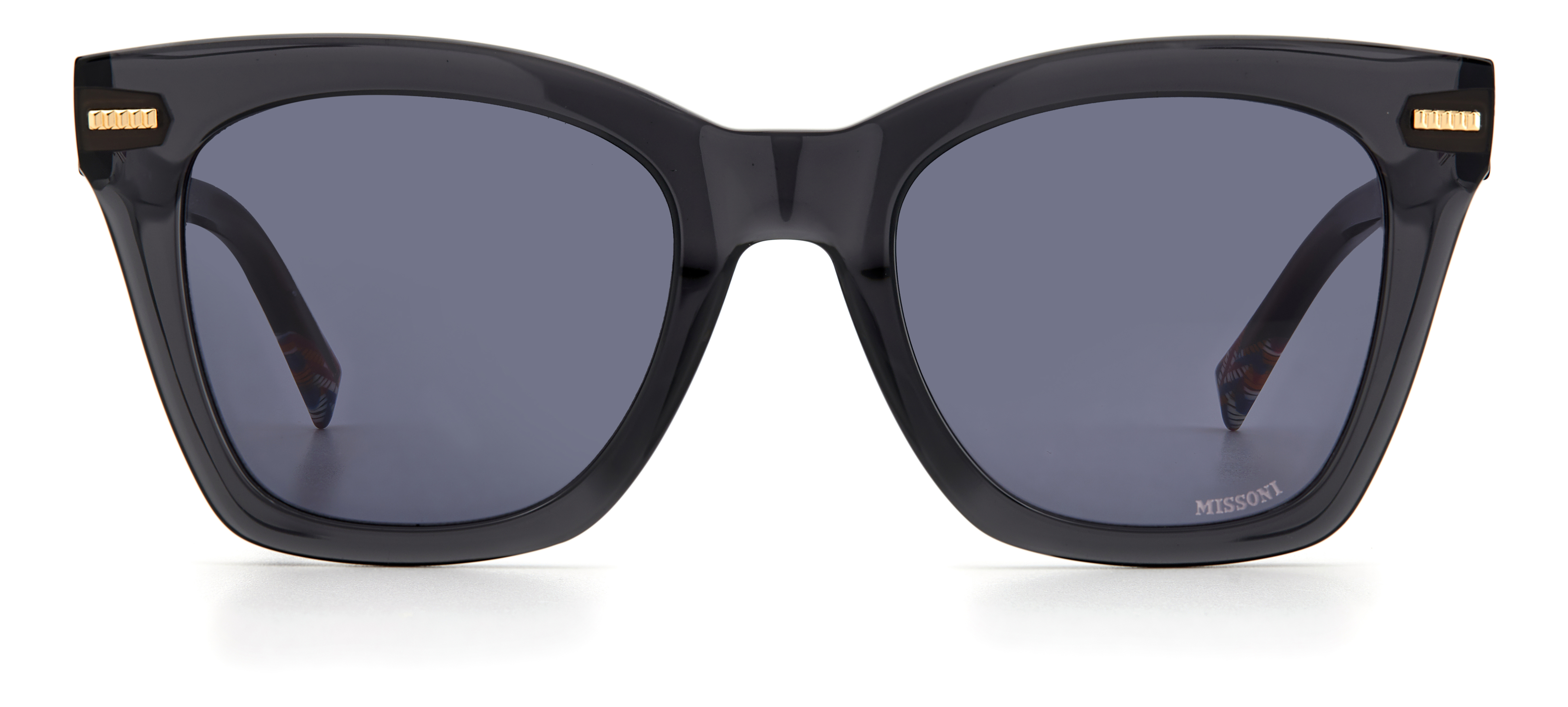 WOMEN SUNGLASSES MISSONI MIS0046SKB7IR (Lens/Bridge/Temple) 51/21/145 mm). Material: ACETATE. Colour: GREY. Measures (Lens/Bridge/Temple): 51/21/145mm. GREY. Missoni's Cuspidi collection presents a range of lounge colors acetate, highlighted with a transparent laminate and finish technique. The soul of the rod with diamond finish is adorned with a logo, which highlights the 3D icón technique