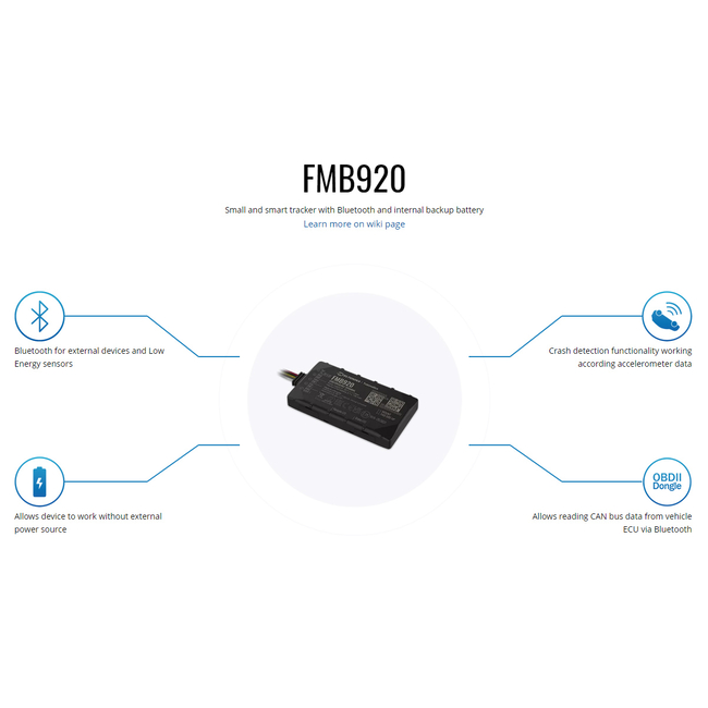 Το FMB920AE5M01 είναι ένα μοντέλο έξυπνης τεχνολογίας και μικρό σε μέγεθος. Υποστηρίζει σύνδεση Bluetooth, έχει εσωτερική κεραία GNSS και GSM μεγάλης εμβέλειας και επίσης διαθέτει εσωτερική μπαταρία. Έχει σχεδιαστεί για τον εντοπισμό ελαφρών μέσων μεταφοράς, όπως ασφαλιστικής τηλεματικής, ενοικιαζόμενα αυτοκίνητα, ανάκτηση κλεμμένων οχημάτων, ασφάλεια δημοσίων υπηρεσιών, μέσα μεταφορών φορτίων, ταξί και πολλών ακόμη οχημάτων. Διαθέτει εισόδους και εξόδους με διαφορετικά σενάρια χρήσης που αναβαθμίζονται. Η ψηφιακή είσοδος μπορεί να χρησιμοποιηθεί για έναρξη της μηχανής, ειδοποίηση ανοίγματος πόρτας ή ενεργοποίηση συναγερμού. Επίσης, διαθέτει απομακρυσμένη χρήση immobilizing με την χρήση της ψηφιακής εξόδου του μοντέλου FMB920AE5M01.