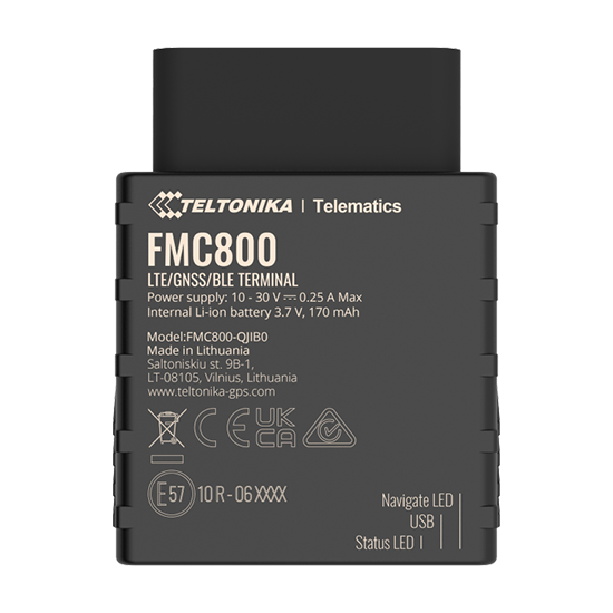 The Teltonika FMC800 is a compact OBDII Plug and Play GPS tracker designed for efficient vehicle monitoring. This device features advanced connectivity options, including 4G LTE Cat 1, GNSS, and Bluetooth LE.