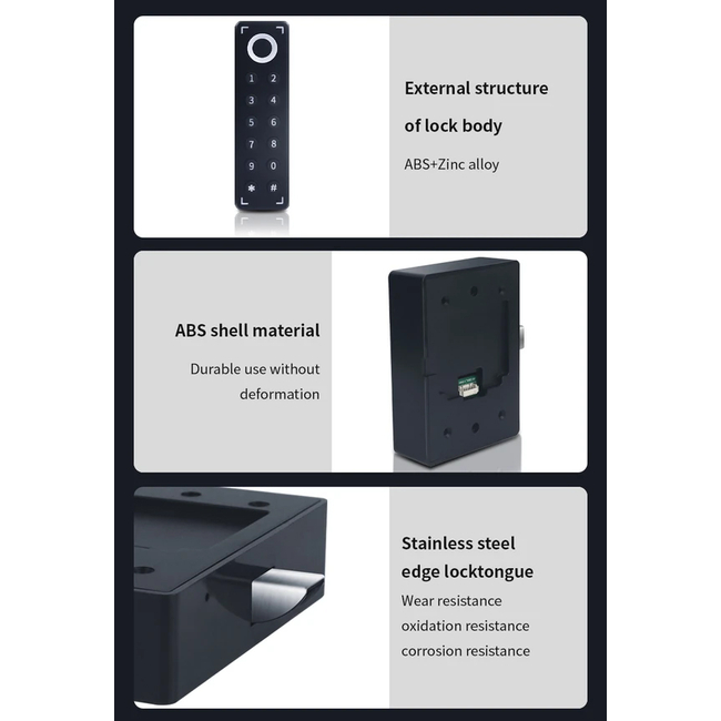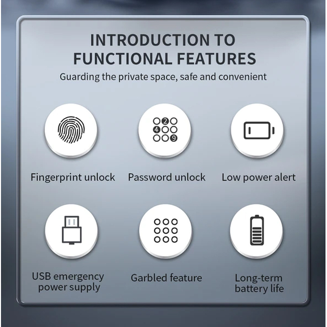 Ηλεκτρικό λουκέτο ασφαλείας της Kerong, ιδανικό για χρήση σε συρτάρια γραφείου, ντουλάπια, φοριαμούς και οποιοδήποτε άλλο μέρος χρειάζεται έξτρα προστασία. Εξοπλίζεται με πάνελ αναγνώρισης δαχτυλικού αποτυπώματος και πληκτρολόγιο 12 ψηφίων, με κωδικό 4 έως 8 ψηφίων. Διαθέτει 3 λειτουργίες public mode, private mode και limited public mode και τροφοδοτείται από 3x μπαταρίες AAA 1.5V (δεν συμπεριλαμβάνονται) ενώ διαθέτει και θύρα USB Micro για τροφοδότηση έκτακτης ανάγκης από εξωτερική πηγή ρεύματος.