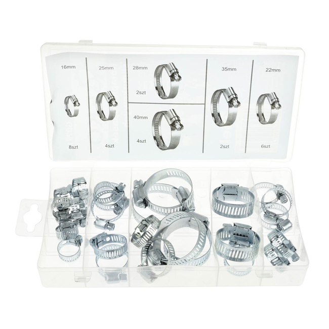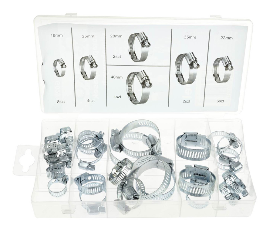 Σετ της GEKO που αποτελείται από 26 μεταλλικούς σφιγκτήρες για λάστιχα, σε διάφορα μεγέθη. Όλα τα εξαρτήματα του σετ είναι τοποθετημένα μέσα σε διάφανη πλαστική θήκη για την εύκολη τακτοποίηση και μεταφορά τους.