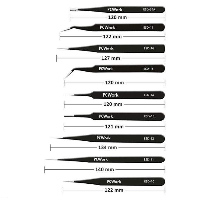 - Variety of Tips: The set includes a variety of tips, each with a specific shape and length, catering to different tasks. For example, one tweezer has a narrow tip with a thin edge (140 mm), while another has a rounded tip (120 mm).
