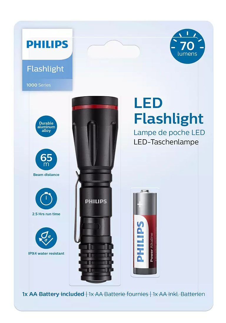 Ελαφρύς και φορητός φακός LED SFL1000P απο την Philips. Ο LED φακός καθημερινής χρήσης, καλύπτει τις ανάγκες σας για φως μέσα αλλά και έξω από το σπίτι. Φτιαγμένος για να τον έχετε πάντοτε στην τσέπη σας, το μικρό του μέγεθος τον κάνει ιδανικό για οποιαδήποτε περίσταση. Τεχνολογία LED που παρέχει άπλετο φως με ελάχιστη κατανάλωση. Παρέχει φωτεινότητα 70 lumens με έως και 2,5 ώρες αυτονομίας με μια μπαταρία ΑΑ (συμπεριλαμβάνεται στην συσκευασία). Ελαφρύς και ανθεκτικός, φτιαγμένος απο κράμα αλουμινίου και με πιστοποίηση IPX4 για να αντέχει σε νερό και υγρασία. Η ακτίνα του μπορεί να φωτίσει έως και τα 65 μέτρα.