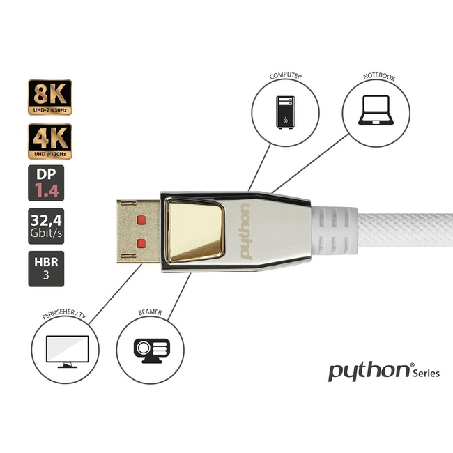 The Python DisplayPort 2.0 Kabel Nylongeflecht wei? 0,5m is a premium quality cable designed for high-performance needs. This 0.5-meter length is perfect for connecting various devices.