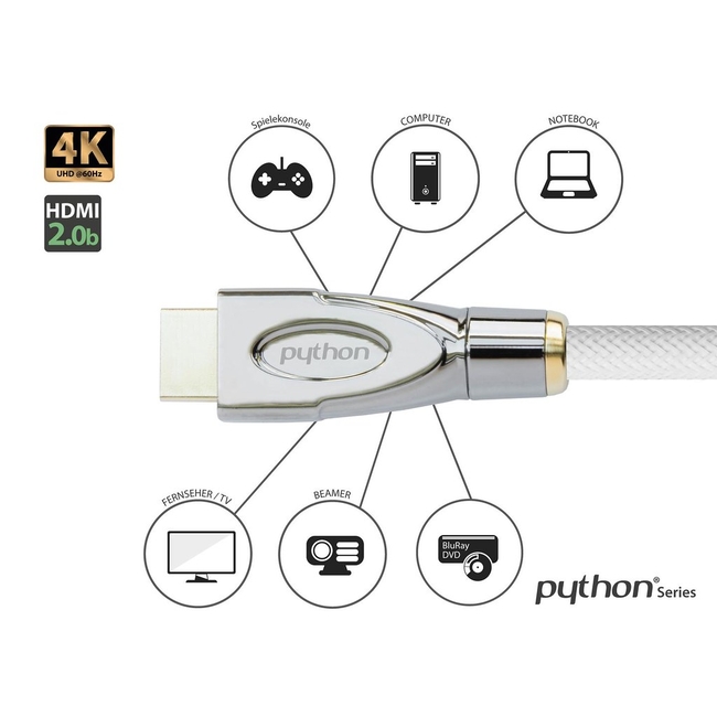 The Python HDMI 2.0 Kabel 4K2K Nylongeflecht wei? 1m is an exceptional HDMI cable that delivers high-performance and durability. Designed to support the latest 4K2K (Ultra High Definition) resolutions at 60Hz, it is perfect for a variety of applications.