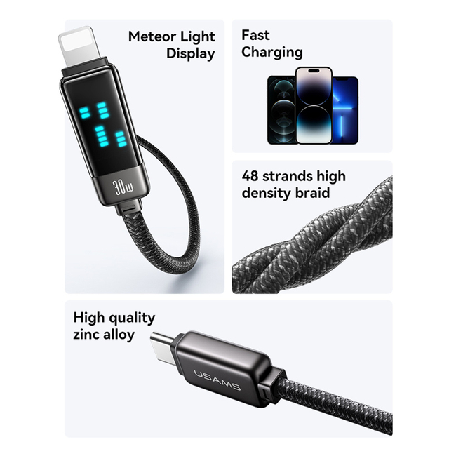 Καλώδιο φόρτισης και μεταφοράς δεδομένων Lightning σε USB-C της Usams. Υποστηρίζει φόρτιση με απόδοση έως 30W και μεταφορά δεδομένων με ταχύτητα έως 480Mbps.