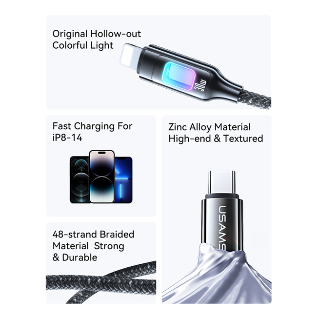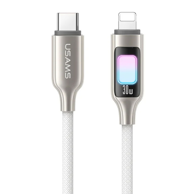 Καλώδιο φόρτισης και μεταφοράς δεδομένων Lightning σε USB-C της Usams. Υποστηρίζει φόρτιση με απόδοση έως 30W και μεταφορά δεδομένων με ταχύτητα έως 480Mbps.