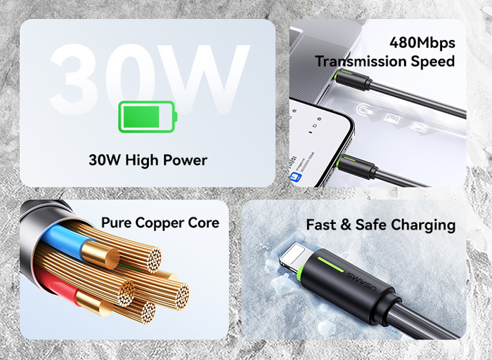 Καλώδιο φόρτισης και μεταφοράς δεδομένων Lightning σε USB-C της Usams. Υποστηρίζει φόρτιση με απόδοση έως 30W και μεταφορά δεδομένων με ταχύτητα έως 480Mbps.