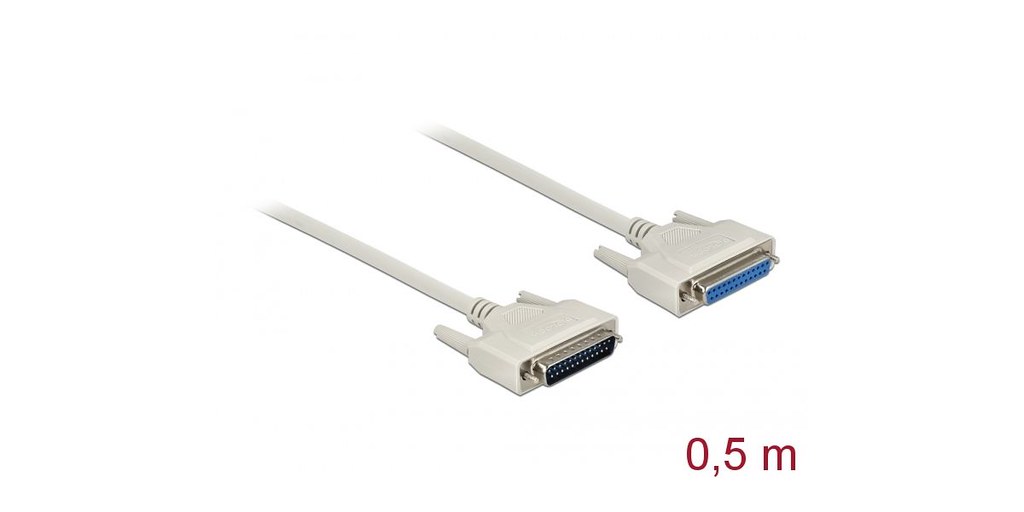 The Delock Serial Cable D-Sub 25 Plug to Socket (male to female), 0.5 m is specifically engineered to facilitate connections between devices that utilize D-Sub 25 pin connectors. This cable boasts a length of 0.5 meters and includes both male and female connectors equipped with screws for secure attachment.