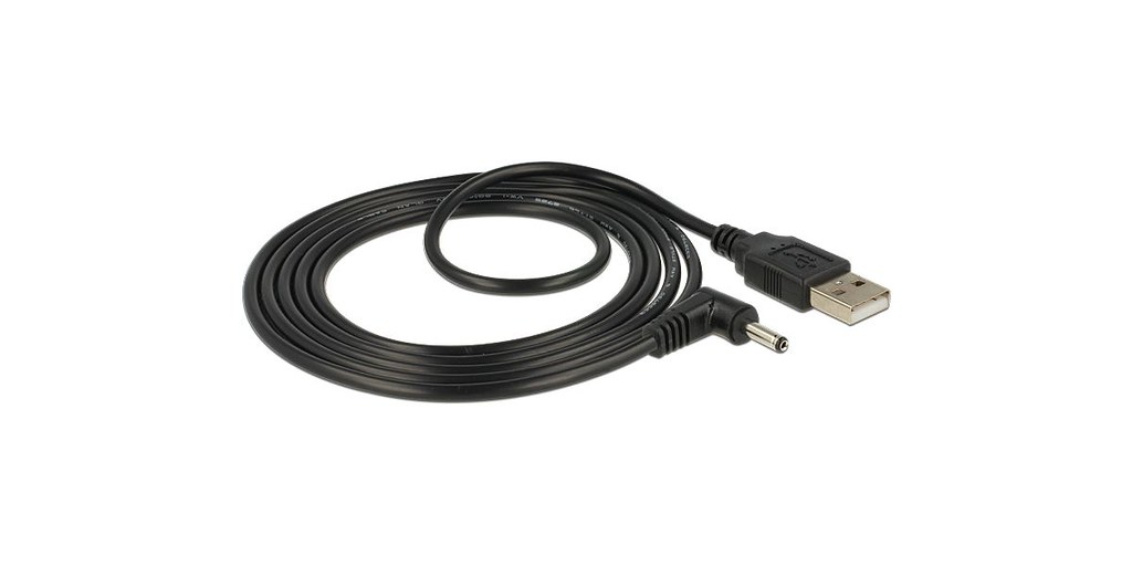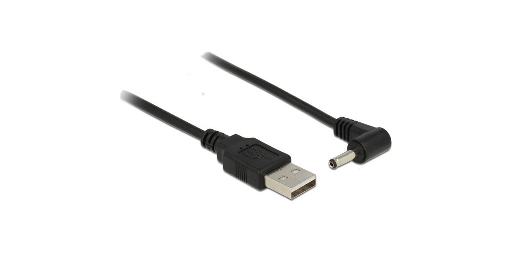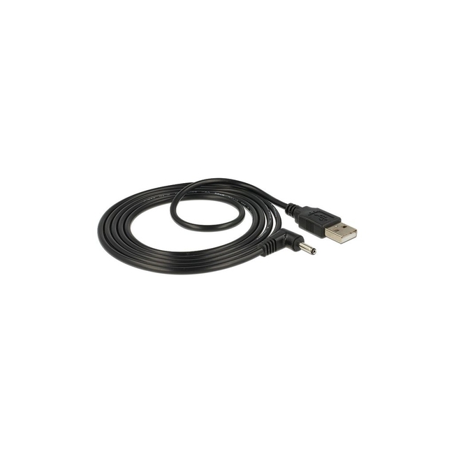 The Delock USB cable USB A -> DC 3.5 x 1.35mm Male 90° 1.50m is specifically designed to supply 5 V power to various external devices such as hubs, converters, or speakers. This cable features a USB Type-A male connector on one end and a right-angled DC power connector on the other end.