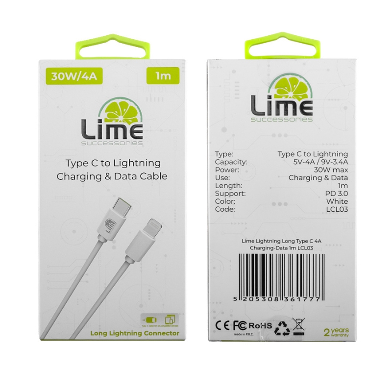 Kαλώδιο USB Lime LCL03 Λευκό USB Type-C σε Lightning Long 4.0A, 1m για φόρτιση και δεδομένα-30W