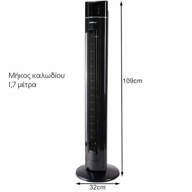 Ανεμιστήρας πύργος δαπέδου ισχύος 60W και ύψους 109 εκατοστών. Περιστρέφεται 65 μοίρες και διαθέτει 3 ταχύτητες. Με τη λειτουργία ιονιστή καθαρίζει την ατμόσφαιρα του χώρου και απομακρύνει τους αλλεργιογόνους παράγοντες για να αναπνέετε πιο ελεύθερα. Επίσης ο χρονοδιακόπτης μπορεί να ρυθμιστεί ώστε να απενεργοποιηθεί ο ανεμιστήρας αυτόματα έως και 7 ώρες. Στο μπροστινό μέρος υπάρχει δισκάκι για τοποθέτηση αρωματικού χώρου, που κάνει την ατμόσφαιρα ακόμα πιο ευχάριστη. Όλες οι λειτουργίες μπορούν να ρυθμιστούν και απομακρυσμένα από το τηλεχειριστήριο.