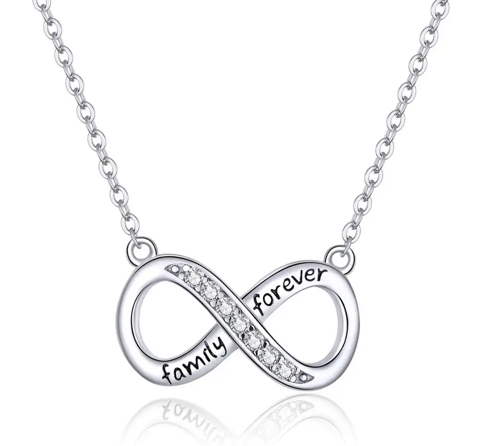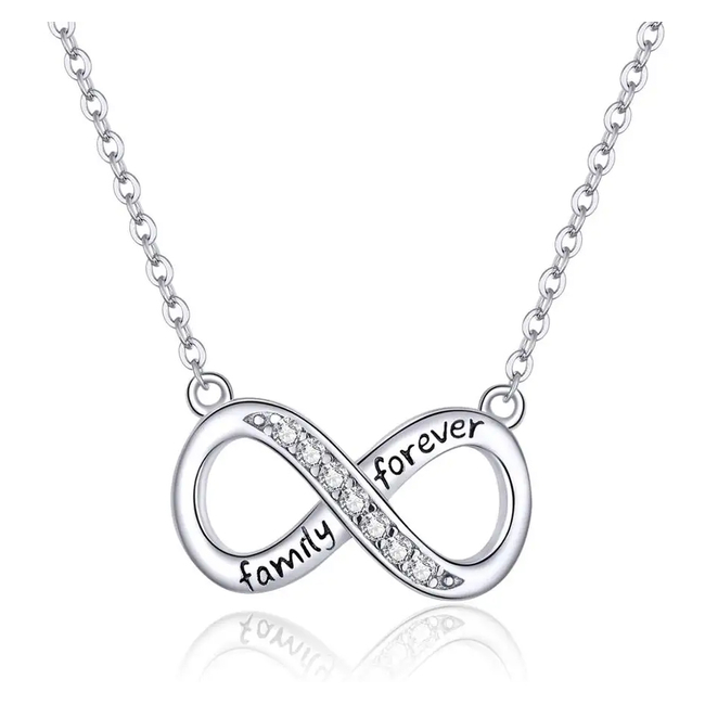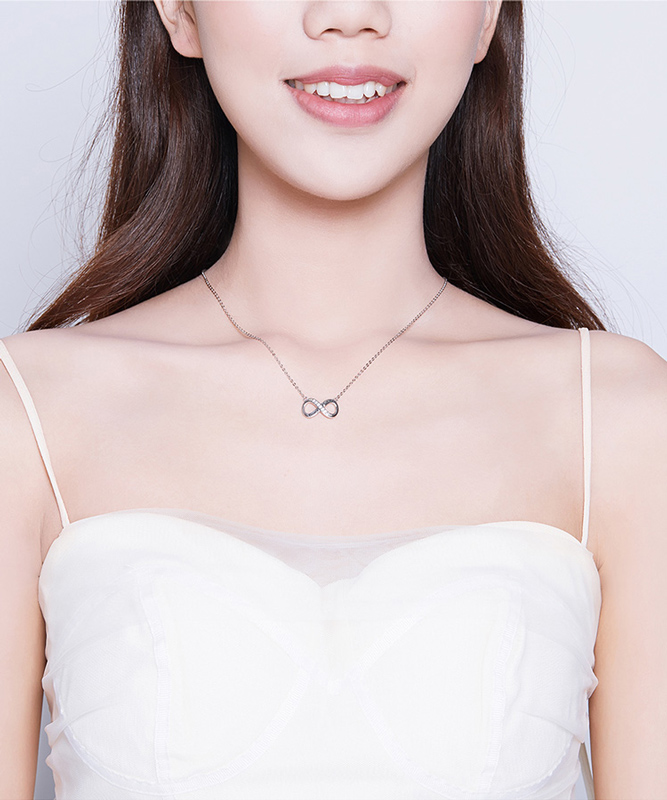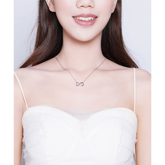 Εντυπωσιακό κολιέ με το σύμβολο του απείρου, σε ασημί χρώμα, διακοσμημένο με κυβική ζιρκόνια, λευκού χρώματος που προσφέρει εξαιρετική λάμψη στο κόσμημα.