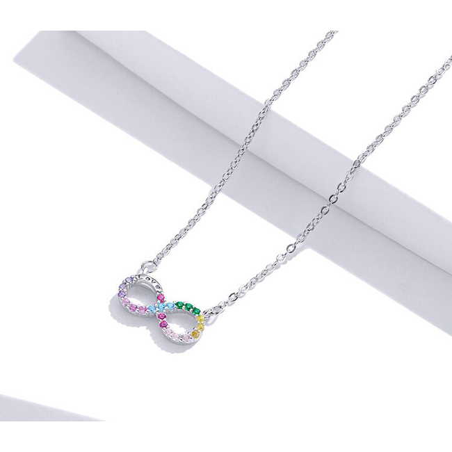 Εντυπωσιακό κολιέ με το σύμβολο του απείρου, σε ασημί χρώμα, διακοσμημένο με κυβική ζιρκόνια σε εντυπωσιακά χρώματα που προσφέρει εξαιρετική λάμψη στο κόσμημα.