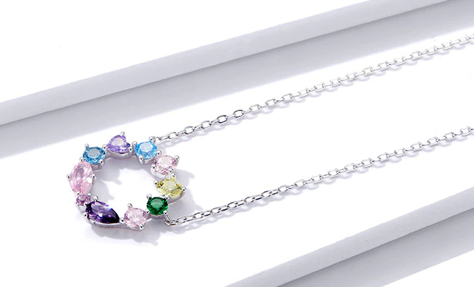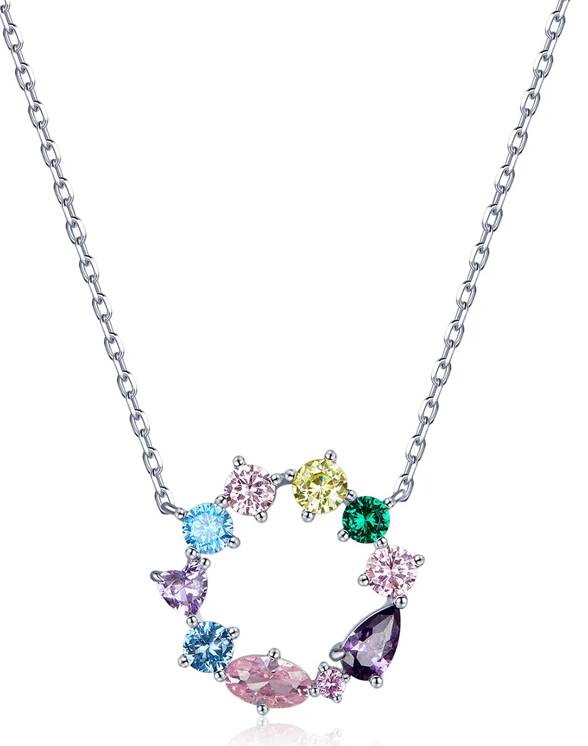 Κομψό κολιέ, διακοσμημένο με κυβική ζιρκόνια σε διάφορες κοπές και εντυπωσιακά χρώματα, η οποία προσφέρει μοναδική λάμψη στο κόσμημα και προσδίδει στυλ σε κάθε εμφάνιση.